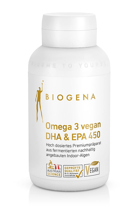 BIOGENA的 Omega 3 vegan DHA & EPA 450含有微藻裂殖壶菌提取的质量有保证的藻油。这种藻油是在室内培养的ˎ可持续生长的藻类经过发酵提纯的产品。对于想要遵循素食饮食习惯或因其他原因想要避免食用鱼类和鱼油的人来说,它是一种理想的替代品。 建议每天服用 3 粒,可摄入1350毫克(900毫克DHA和450毫克EPA)珍贵的欧米伽-3脂肪酸。